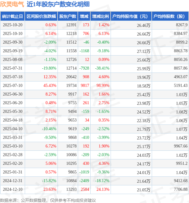 从股价来看,2025年10月10日至2025年10月20日,欣灵电气区间涨幅为0.63%,在此期间股东户数增加173.0户,增幅为1.42%。