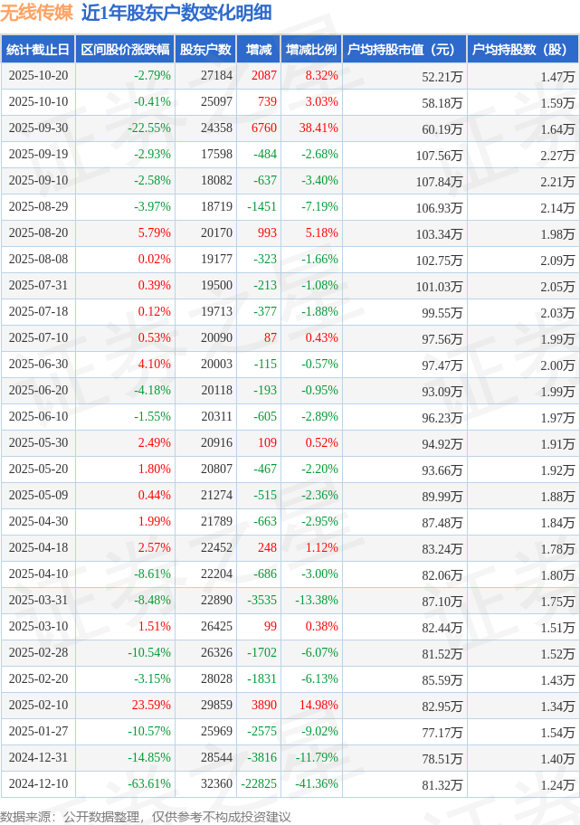 从股价来看,2025年10月10日至2025年10月20日,无线传媒区间跌幅为2.79%,在此期间股东户数增加2087.0户,增幅为8.32%。