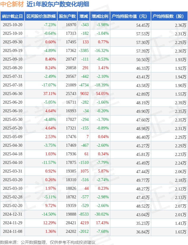从股价来看,2025年10月10日至2025年10月20日,中仑新材区间跌幅为7.23%,在此期间股东户数减少343.0户,减幅为1.98%。