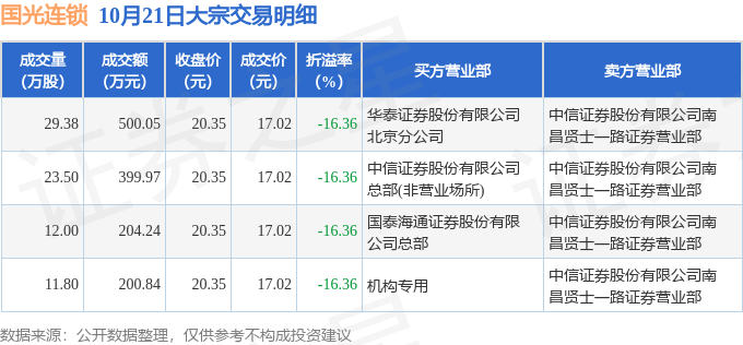 证券之星消息,10月21日国光连锁发生大宗交易,交易数据如下: