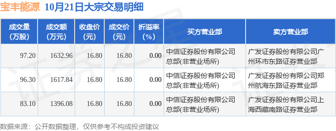 证券之星消息,10月21日宝丰能源发生大宗交易,交易数据如下: