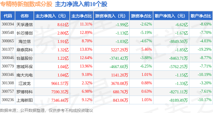资金流向方面,专精特新(399267)指数成份股当日主力资金净流入合计20.81亿元,游资资金净流出合计2.16亿元,散户资金净流出合计18.65亿元。成份股资金流向详情见下表: