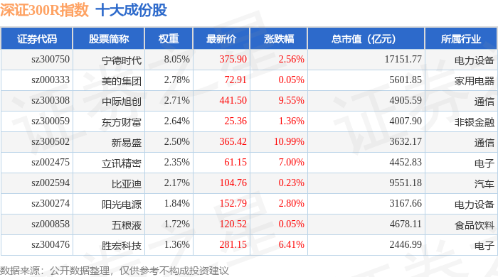深证300R(399344)指数十大成份股详情如下: