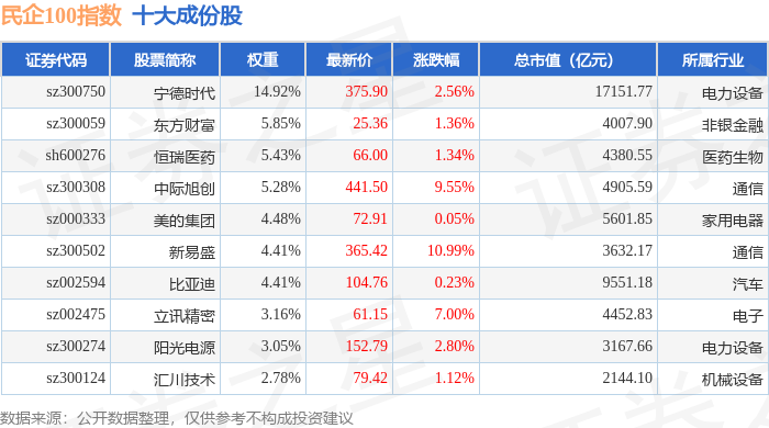 证券之星消息,10月21日,民企100(399362)指数报收于8553.47点,涨2.91%,成交2243.72亿元,换手率1.63%。当日该指数成份股中,上涨的有90家,新易盛以10.99%的涨幅领涨,下跌的有9家,伟明环保以2.5%的跌幅领跌。