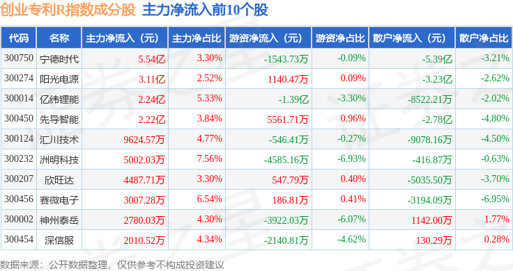 资金流向方面,创业专利R(470068)指数成份股当日主力资金净流入合计7.45亿元,游资资金净流出合计2.91亿元,散户资金净流出合计4.54亿元。成份股资金流向详情见下表: