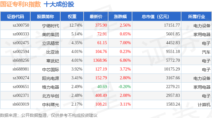 证券之星消息,10月21日,国证专利R(480070)指数报收于4528.88点,涨2.09%,成交2023.89亿元,换手率1.13%。当日该指数成份股中,上涨的有88家,视源股份以8.14%的涨幅领涨,下跌的有10家,中国移动以1.54%的跌幅领跌。