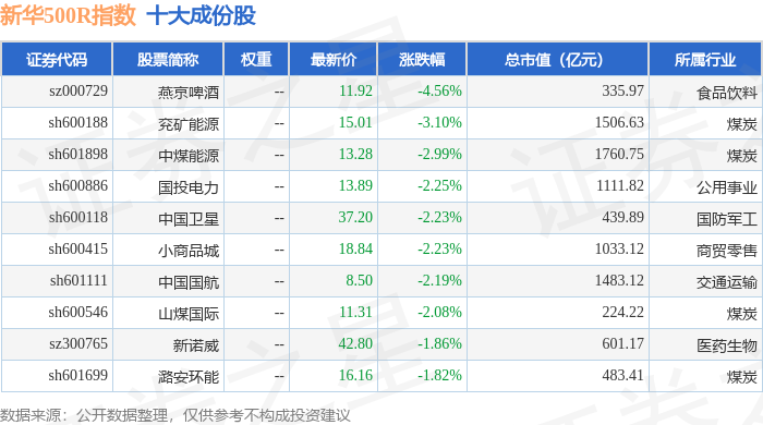 新华500R(489001)指数十大成份股详情如下: