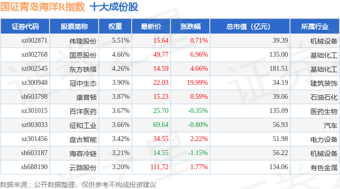 国证青岛海洋R(480532)指数十大成份股详情如下: