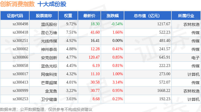 创新消费(970041)指数十大成份股详情如下: