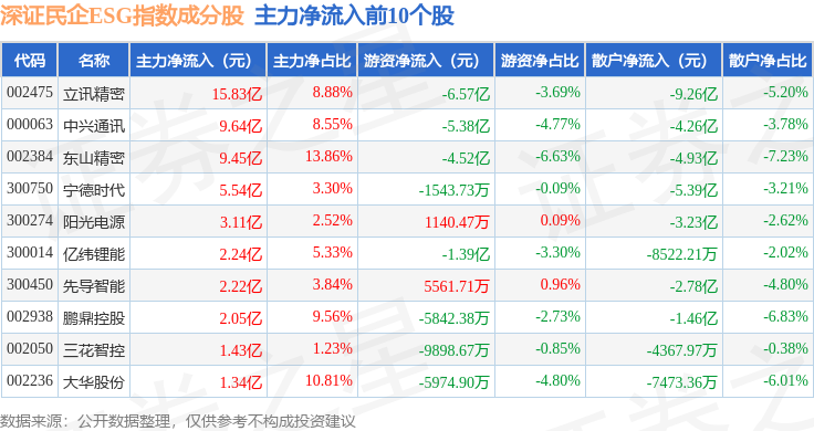 资金流向方面,深证民企ESG(970056)指数成份股当日主力资金净流入合计50.02亿元,游资资金净流出合计20.19亿元,散户资金净流出合计29.83亿元。成份股资金流向详情见下表:
