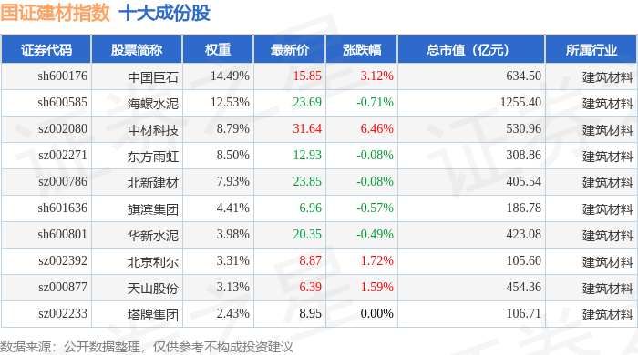 证券之星消息,10月21日,国证建材(980048)指数报收于4784.21点,涨1.27%,成交78.55亿元,换手率1.55%。当日该指数成份股中,上涨的有21家,中材科技以6.46%的涨幅领涨,下跌的有6家,沧州明珠以2.93%的跌幅领跌。