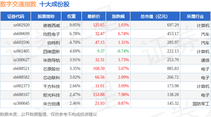 证券之星消息,10月21日,数字交通(980075)指数报收于3218.62点,涨1.95%,成交253.32亿元,换手率1.8%。当日该指数成份股中,上涨的有46家,炬光科技以7.98%的涨幅领涨,下跌的有4家,振芯科技以1.98%的跌幅领跌。