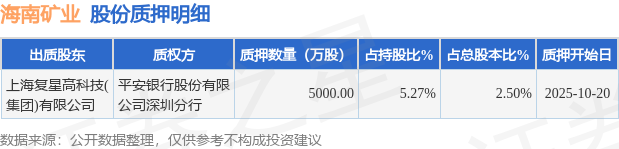 证券之星消息,海南矿业(601969)10月21日公开信息显示,股东上海复星高科技(集团)有限公司向平安银行股份有限公司深圳分行合计质押5000.0万股,占总股本2.5%。质押详情见下表: