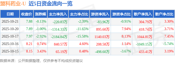 证券之星消息,截至2025年10月21日收盘,盟科药业(688373)报收于7.88元,下跌0.13%,换手率2.22%,成交量11.66万手,成交额9233.09万元。