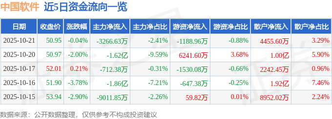 证券之星消息,截至2025年10月21日收盘,中国软件(600536)报收于50.95元,下跌0.04%,换手率3.17%,成交量26.75万手,成交额13.54亿元。