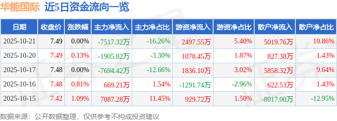 证券之星消息,截至2025年10月21日收盘,华能国际(600011)报收于7.49元,上涨0.0%,换手率0.56%,成交量61.94万手,成交额4.62亿元。