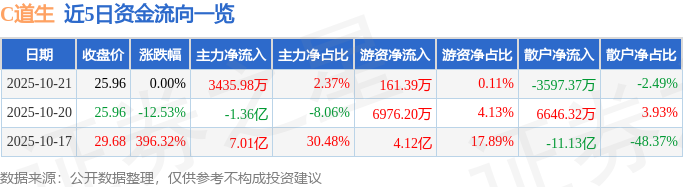 证券之星消息,截至2025年10月21日收盘,C道生(601026)报收于25.96元,上涨0.0%,换手率51.84%,成交量55.56万手,成交额14.47亿元。