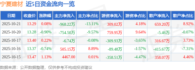证券之星消息,截至2025年10月21日收盘,宁夏建材(600449)报收于13.29元,上涨0.08%,换手率1.17%,成交量5.57万手,成交额7387.42万元。