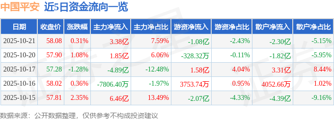 证券之星消息,截至2025年10月21日收盘,中国平安(601318)报收于58.08元,上涨0.31%,换手率0.72%,成交量76.22万手,成交额44.56亿元。