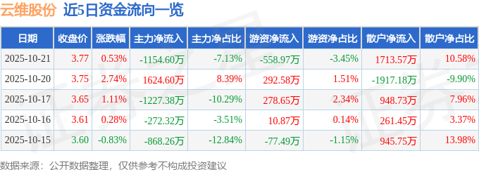 证券之星消息,截至2025年10月21日收盘,云维股份(600725)报收于3.77元,上涨0.53%,换手率3.52%,成交量43.44万手,成交额1.62亿元。
