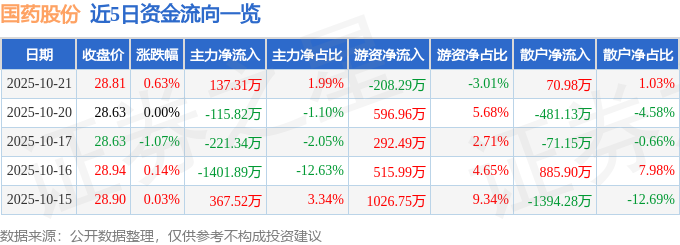 证券之星消息,截至2025年10月21日收盘,国药股份(600511)报收于28.81元,上涨0.63%,换手率0.43%,成交量2.4万手,成交额6913.09万元。