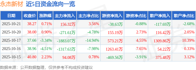 证券之星消息,截至2025年10月21日收盘,永杰新材(603271)报收于38.27元,上涨0.71%,换手率2.92%,成交量1.15万手,成交额4395.89万元。