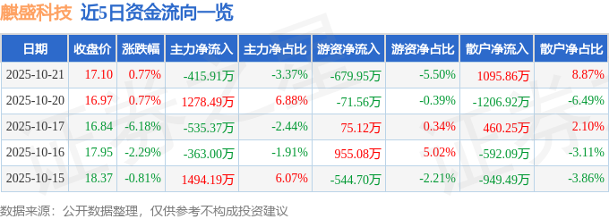 证券之星消息,截至2025年10月21日收盘,麒盛科技(603610)报收于17.1元,上涨0.77%,换手率2.05%,成交量7.23万手,成交额1.24亿元。