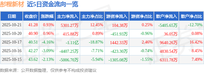 10月21日的资金流向数据方面,主力资金净流入5301.27万元,占总成交额12.45%,游资资金净流入104.38万元,占总成交额0.25%,散户资金净流出5405.65万元,占总成交额12.7%。