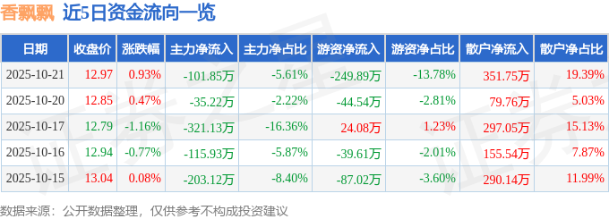 10月21日的资金流向数据方面,主力资金净流出101.85万元,占总成交额5.61%,游资资金净流出249.89万元,占总成交额13.78%,散户资金净流入351.75万元,占总成交额19.39%。