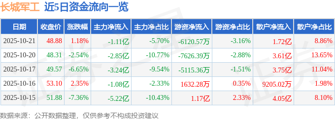 证券之星消息,截至2025年10月21日收盘,长城军工(601606)报收于48.88元,上涨1.18%,换手率5.52%,成交量40.01万手,成交额19.38亿元。