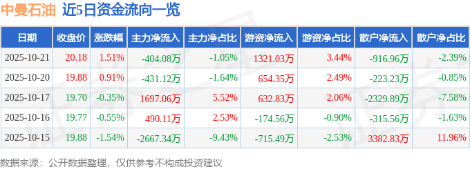 证券之星消息,截至2025年10月21日收盘,中曼石油(603619)报收于20.18元,上涨1.51%,换手率4.12%,成交量19.06万手,成交额3.84亿元。
