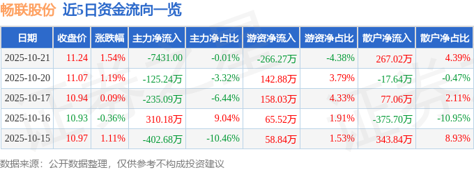 证券之星消息,截至2025年10月21日收盘,畅联股份(603648)报收于11.24元,上涨1.54%,换手率1.5%,成交量5.44万手,成交额6077.41万元。