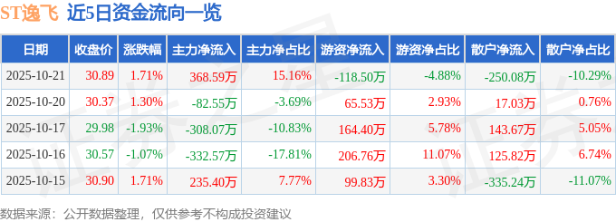 证券之星消息,截至2025年10月21日收盘,ST逸飞(688646)报收于30.89元,上涨1.71%,换手率1.34%,成交量7890.0手,成交额2430.73万元。