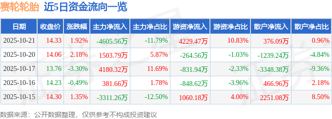 证券之星消息,截至2025年10月21日收盘,赛轮轮胎(601058)报收于14.33元,上涨1.92%,换手率0.83%,成交量27.24万手,成交额3.91亿元。