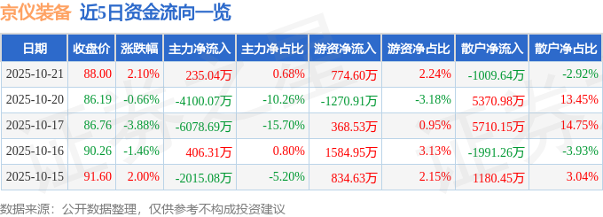 证券之星消息,截至2025年10月21日收盘,京仪装备(688652)报收于88.0元,上涨2.1%,换手率3.32%,成交量3.95万手,成交额3.45亿元。