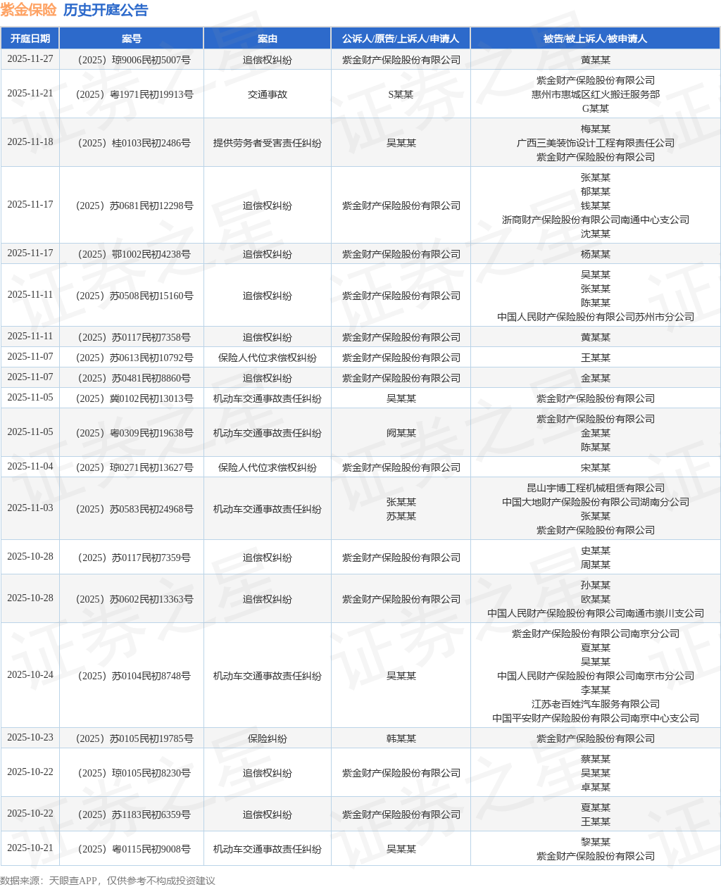 案号:(2025)苏0104民初8748号根据统计,近一年内以紫金财产保险股份有限公司为当事人的历史开庭公告有908则,其中案由为“机动车交通事故责任纠纷”的公告以352则居首,其次为“追偿权纠纷”有340则,“保险人代位求偿权纠纷”有84则。历史开庭公告(前20条)如下: