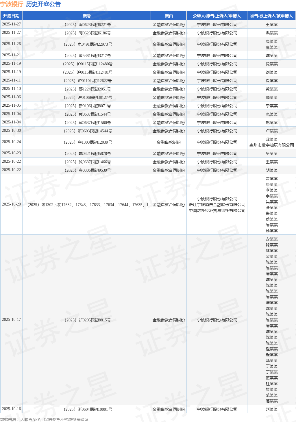 案号:(2025)粤1303民初12039号根据统计,近一年内以宁波银行股份有限公司为当事人的历史开庭公告有1857则,其中案由为“金融借款合同纠纷”的公告以1639则居首,其次为“借款”有126则,“借款合同纠纷”有54则。历史开庭公告(前20条)如下: