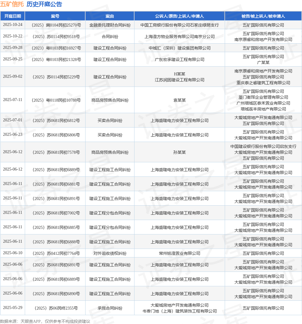 案号:(2025)冀0104民初25270号根据统计,近一年内以五矿国际信托有限公司为当事人的历史开庭公告有53则,其中案由为“建设工程合同纠纷”的公告以9则居首,其次为“建设工程施工合同纠纷”有9则,“商品房预售合同纠纷”有7则。历史开庭公告(前20条)如下: