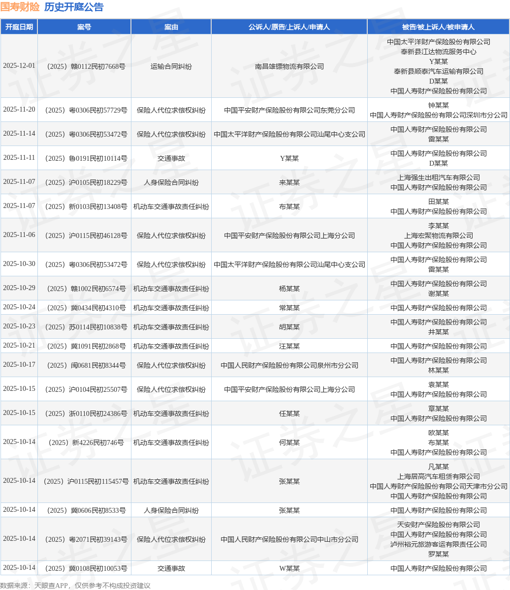 案号:(2025)冀0434民初4310号根据统计,近一年内以中国人寿财产保险股份有限公司为当事人的历史开庭公告有474则,其中案由为“机动车交通事故责任纠纷”的公告以310则居首,其次为“保险人代位求偿权纠纷”有46则,“保险纠纷”有15则。历史开庭公告(前20条)如下:
