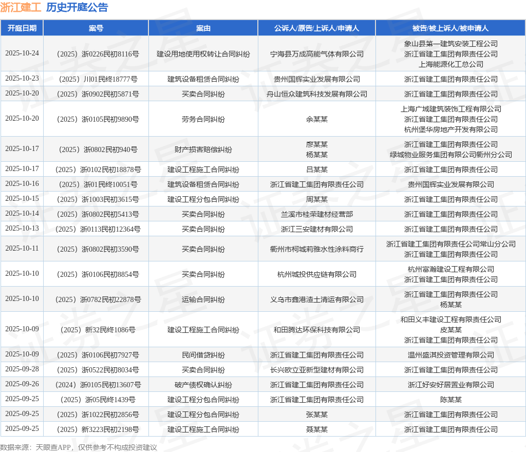 案号:(2025)浙0226民初8116号根据统计,近一年内以浙江省建工集团有限责任公司为当事人的历史开庭公告有426则,其中案由为“建设工程施工合同纠纷”的公告以150则居首,其次为“买卖合同纠纷”有88则,“建设工程分包合同纠纷”有46则。历史开庭公告(前20条)如下: