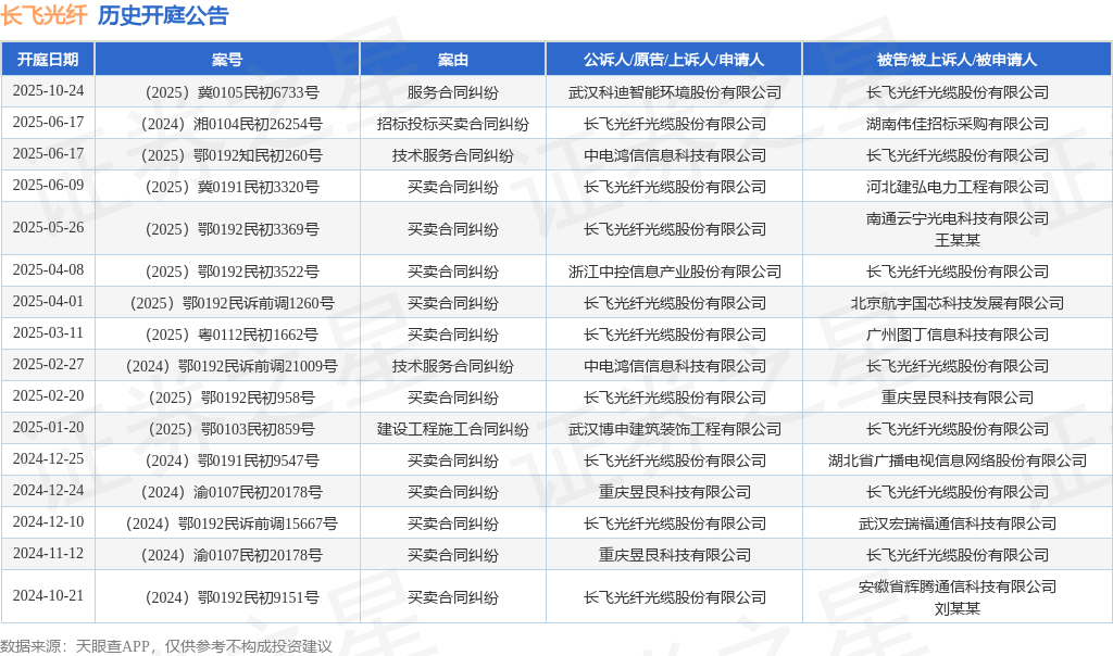 案号:(2025)冀0105民初6733号根据统计,近一年内以长飞光纤光缆股份有限公司为当事人的历史开庭公告有16则,其中案由为“买卖合同纠纷”的公告以11则居首,其次为“技术服务合同纠纷”有2则,“建设工程施工合同纠纷”有1则。历史开庭公告如下: