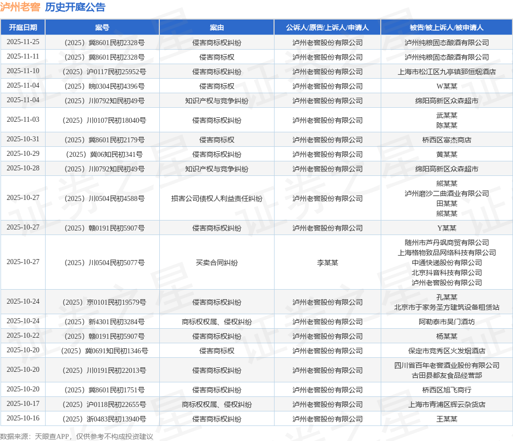 案号:(2025)新4301民初3284号根据统计,近一年内以泸州老窖股份有限公司为当事人的历史开庭公告有358则,其中案由为“侵害商标权纠纷”的公告以265则居首,其次为“侵害商标权”有46则,“商标权权属、侵权纠纷”有11则。历史开庭公告(前20条)如下: