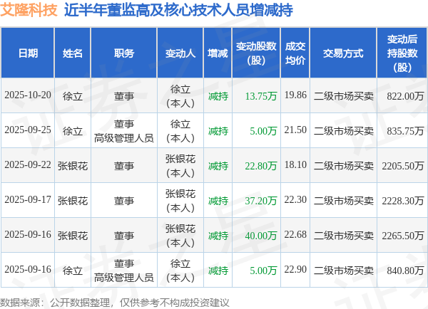 艾隆科技近半年内的董监高及核心技术人员增减持详情如下: