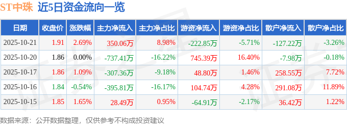 证券之星消息,截至2025年10月21日收盘,ST中珠(600568)报收于1.91元,上涨2.69%,换手率1.25%,成交量20.78万手,成交额3899.41万元。