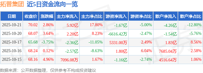 证券之星消息,截至2025年10月21日收盘,拓普集团(601689)报收于70.02元,上涨2.86%,换手率2.76%,成交量48.03万手,成交额33.27亿元。