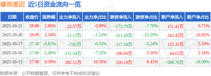 证券之星消息,截至2025年10月21日收盘,睿昂基因(688217)报收于28.8元,上涨2.86%,换手率1.42%,成交量7926.0手,成交额2257.18万元。