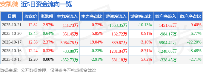 证券之星消息,截至2025年10月21日收盘,安凯微(688620)报收于12.82元,上涨2.97%,换手率5.2%,成交量12.09万手,成交额1.54亿元。
