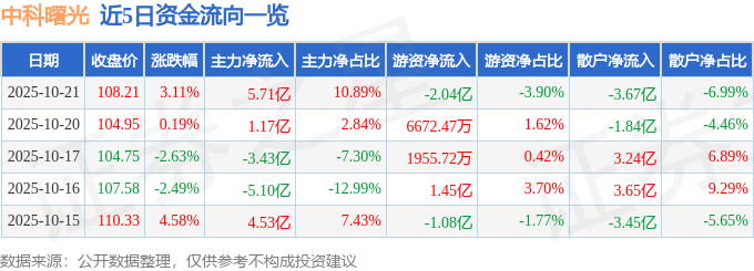 证券之星消息,截至2025年10月21日收盘,中科曙光(603019)报收于108.21元,上涨3.11%,换手率3.34%,成交量48.88万手,成交额52.41亿元。
