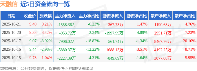 10月21日的资金流向数据方面,主力资金净流出1558.36万元,占总成交额6.23%,游资资金净流入367.73万元,占总成交额1.47%,散户资金净流入1190.63万元,占总成交额4.76%。