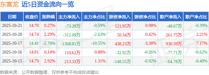 10月21日的资金流向数据方面,主力资金净流出73.28万元,占总成交额0.59%,游资资金净流入121.95万元,占总成交额0.98%,散户资金净流出48.67万元,占总成交额0.39%。